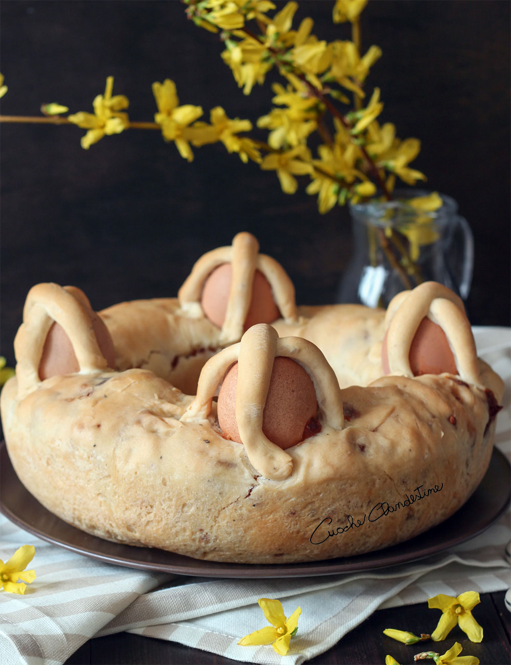 English. After that time, preheat the oven to 170°C. Put the 4 eggs (perfectly clean) onto the top of the Casatiello. Make a kind of cage with the dough “cigars” you made.