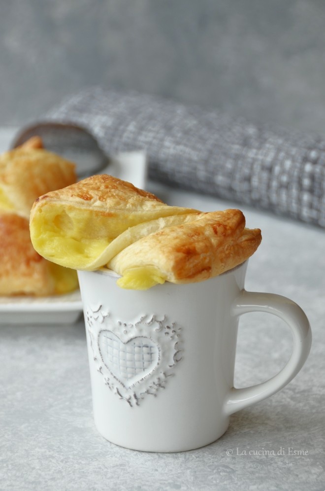 Iniziate preparando la crema pasticcera, se volete qui potrete trovare le indicazioni per eseguirla, una volta pronta mettetela in un contenitore in vetro con della pellicola a contatto e lasciatela raffreddare. Trascorso questo tempo, srotolate la pasta sfoglia, distribuite uno strato di crema sulla metà superiore della superfice della sfoglia, lasciando qualche millimetro di bordo esterno vuoto. Prendete il lato di sfoglia rimasto vuoto e appoggiatelo sulla crema così da “chiudere” il rettangolo. Ora premete delicatamente i bordi esterni per farli sigillare. Con una rotella tagliapasta, o un coltello affilato, tagliate delle strisce in senso verticale, di circa 4 cm di larghezza. Prendete delicatamente ogni pezzo ottenuto e “attorcigliatelo” al centro, e posizionateli su una teglia precedentemente foderata di carta forno. Spennellate con del latte, spolverate con un poco di zucchero di canna ed infornare a 180° per circa 20 minuti. Servitele tiepide o a temperatura ambiente. Buon appetito !