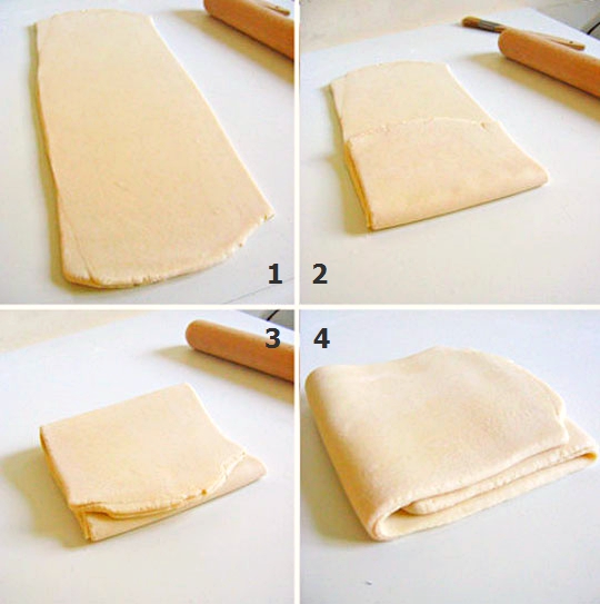 Togliete la pasta dalla pellicola e disponetela con il lato corto verso di voi, con il margine esterno in vista alla vostra destra, esattamente come nel punto 4. Stendete l’impasto con il mattarello, allungandone solo il lato lungo come nel punto 1. Ripiegate ancora l’impasto in tre come prima, senza aggiungere altro burro, come vedete nei punti 2 e 3. Ruotatelo con il margine esterno sempre alla vostra destra, riportandolo in posizione 4. Ripetete l’operazione: allungate il lato lungo e piegate in tre. Coprite con la pellicola e lasciate in frigo altri 45 minuti.