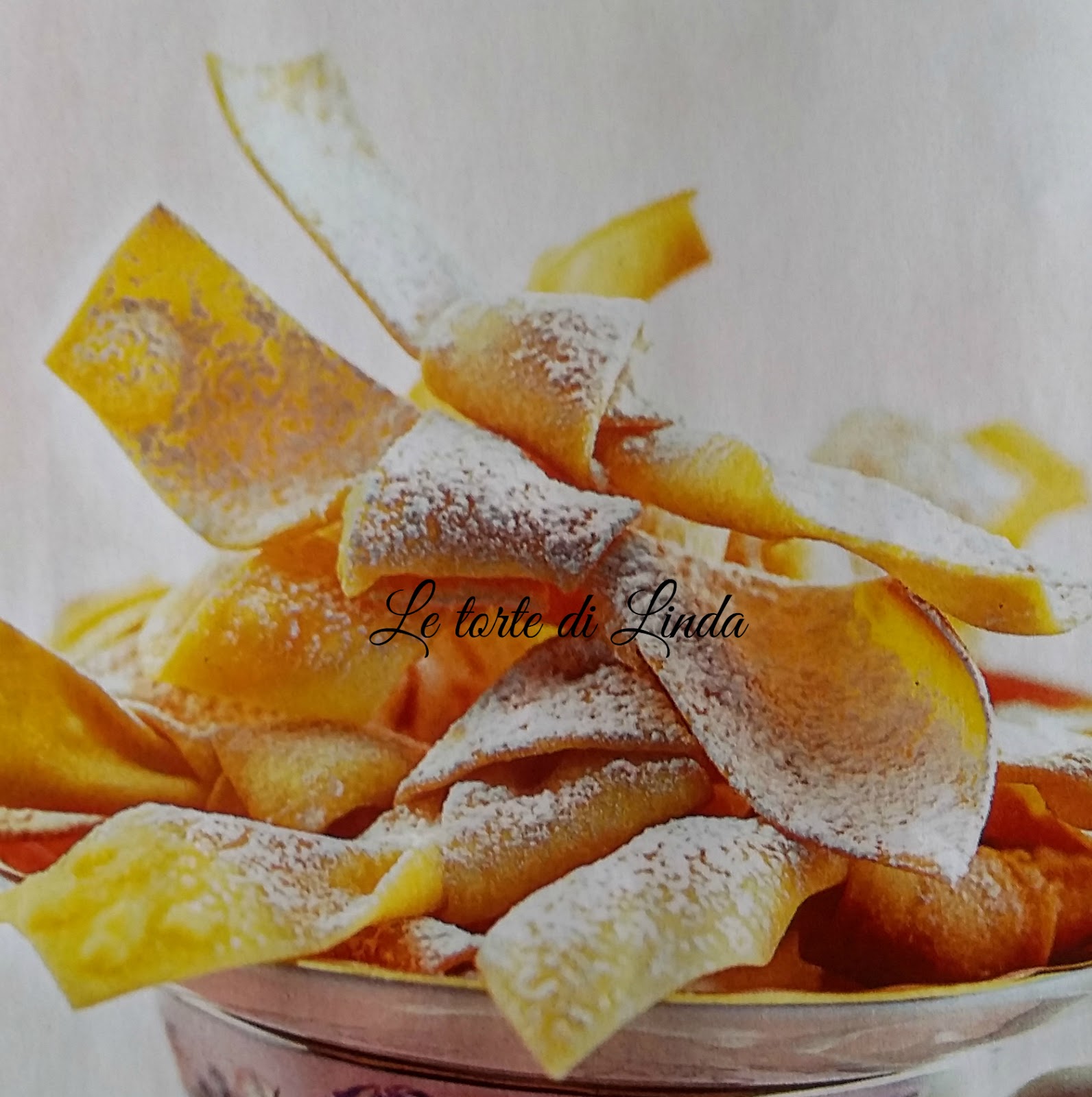 Friggete i nastrini, pochi alla volta, in abbondante olio ben caldo; sgocciolateli su un foglio di carta assorbente e cospargeteli di zucchero a velo.