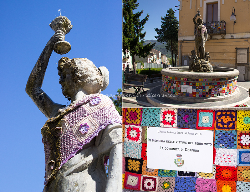 Un paese piccolo ma con una grande Storia, infatti, più di duemila anni fa l’antica Corfinium fu eletta Capitale dei Popoli Italici nella Guerra Sociale contro Roma (91-89 a.C.). E proprio qui venne coniata la moneta della Lega Italica dove, per la prima volta, apparve il nome “ITALIA”, a identificare un’unione di popoli con una strategia politica comune. Arrivati nella piazza di Corfinio, veniamo accolti in Piazza Umberto I da Tiziana Taucci, socio dirigente della cooperativa di Cominità “La Mosca Bianca”. Tutti i componenti del gruppo Tour Qui da Noi Abruzzo sono rimasti incantati dalla Fontana di Gemma rivestita con quadretti di merletti fatti a uncinetto in ricordo delle vittime del terremoto dell’Aquila del 6 Aprile 2009.
