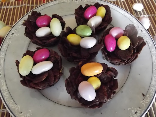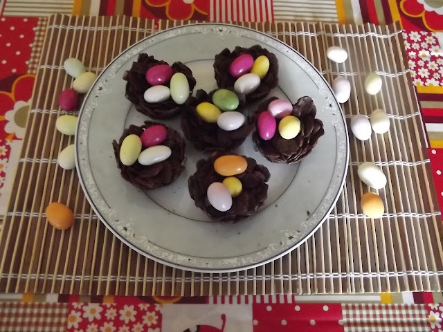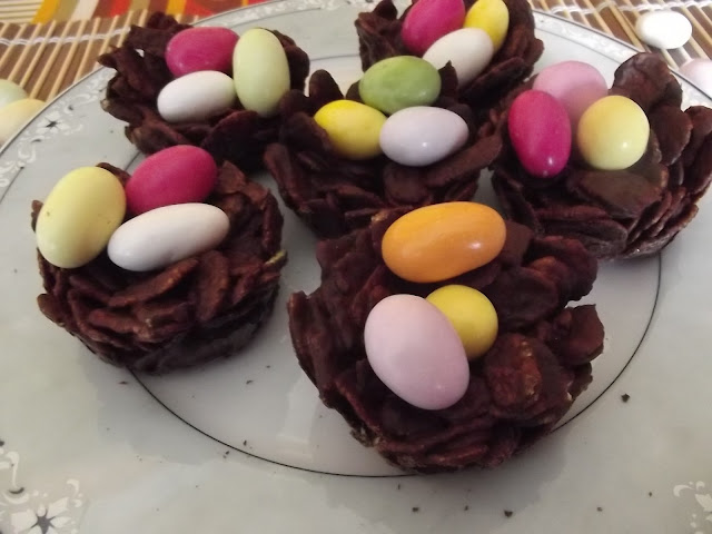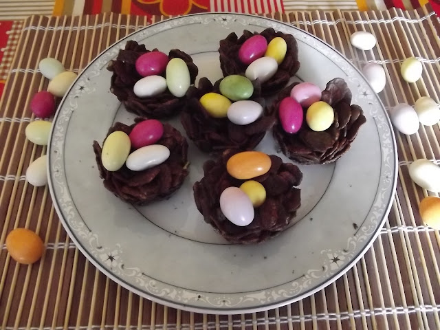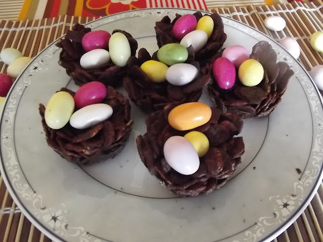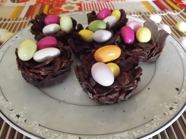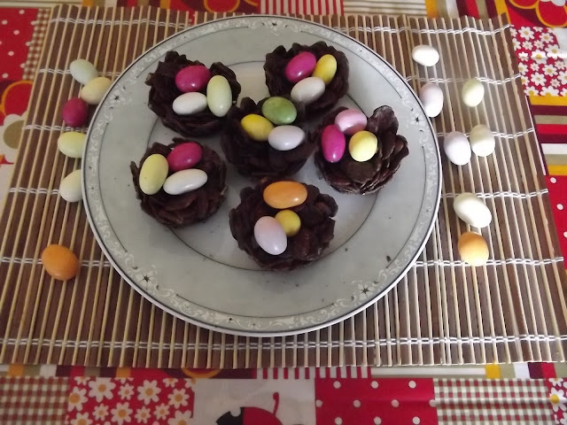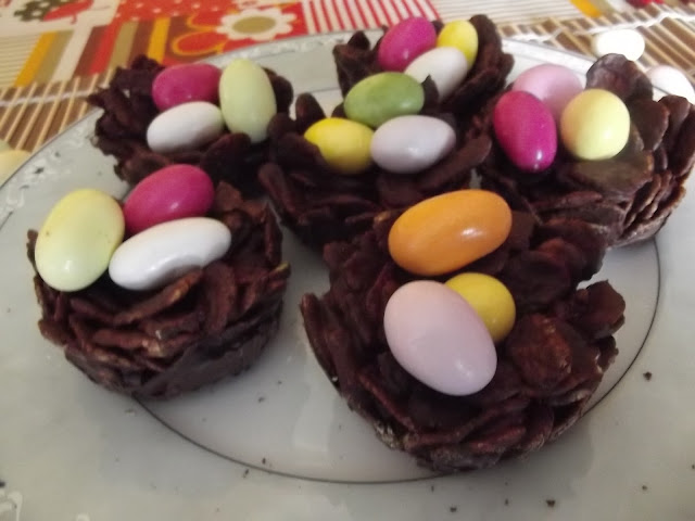 Sciogliete a bagnomaria il cioccolato, quindi buttateci dentro i cornflakes e amalgamate bene. Sistemate un po’ di composto nei pirottini di stagnola avendo cura di schiacciarli un po’ per farli aderire alle pareti. Sistemate i nidi in frigo per circa un’ora, poi staccateli dai pirottini e metteteci sopra gli ovetti di cioccolato colorati.