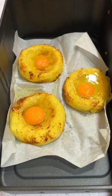 Le patate bollite e schiacciate, insaporite con sale e parmigiano, diventano una base morbida e saporita che, una volta modellata a nido, accoglie al centro l’uovo. Dopo una prima cottura in friggitrice ad aria, infatti, basta aggiungere l’uovo e proseguire la cottura per ottenere un risultato perfetto: patate dorate fuori, morbide dentro e uovo cremoso al punto giusto.