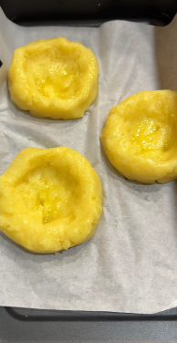 Con le mani leggermente inumidite, dividi l’impasto in tre porzioni e forma dei nidi, creando un incavo centrale ben definito. Spennella la superficie con olio extravergine di oliva e disponi i nidi nel cestello della friggitrice ad aria, sopra un foglio di carta forno.