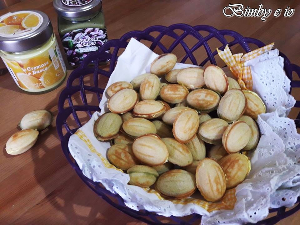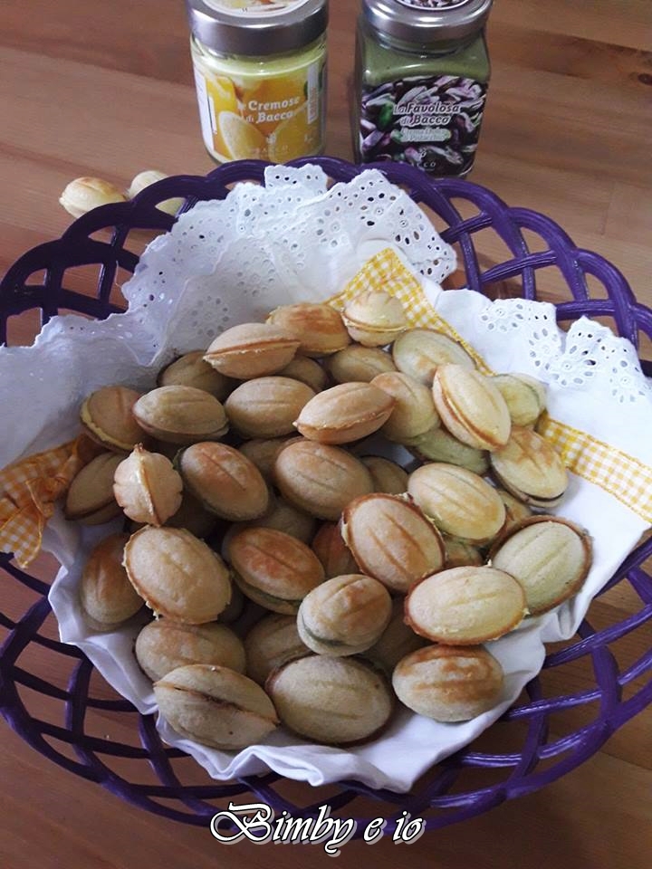 Eccomi con un’altra ricetta sfiziosa, prepararli e’ semplice ma ci vuole un poco di pazienza per l’insieme della realizzazione, sono delle noci dolci realizzate con una cialda croccante tipo wafer, potete farcirli in vari modi, io ho utilizzato nutella classica, nutella al pistacchio e cremosa al limone.