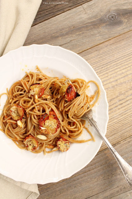 Il procedimento è semplicissimo. In una padella versare i pomodorini e la loro salsa (tenendone da parte circa 4-5) assieme ad un cucchiaio di olio evo e uno spicchio d’aglio. Lasciar cuocere a fuoco lento per una decina di minuti, aggiungere un pizzico di zucchero e aggiustare di sale e pepe. Tagliare i pomodorini mesi da parte a metà e cospargeteli con del pangrattato precedentemente condito con un trito di erbe aromatiche (per me salvia e rosmarino), sale e un filo di olio. Portare il forno a 200°C e lasciar gratinare i pomodorini finché non saranno asciutti e ben dorati (serviranno 15-20 minuti). Tostare le mandorle o in forno o in padella. Quando i pomodorini saranno quasi pronti buttare la pasta. Una volta cotta (mi raccomando lasciatela al dente) saltarla nella salsa di pomodoro. Servire gli spaghetti con i pomodorini gratinati, le mandorle a scaglie e un filo di olio evo a crudo.