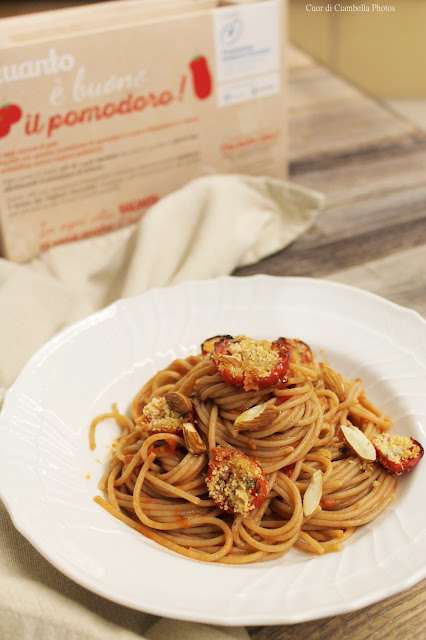 Oggi vi voglio parlare di un bellissimo progetto, della quale sono ambassador, ovvero “IL POMODORO. BUONO PER TE, BUONO PER LA RICERCA” iniziativa della FondazioneUmberto Veronesi. Sabato 10 e domenica 11 marzo sosteniamo la ricerca scientifica acquistando una confezione di tre preparati di pomodoro (passata, pelati e pomodorini) a fonte di una donazione di soli 10 euro! In questo modo potrete aiutare i bambini affetti da tumore ad aver accesso alle migliori curi possibili! Potrete trovare questa raccolta fondi in oltre 100 piazze (l’elenco delle piazze su www.fondazioneveronesi.it). Ed è proprio per questa occasione che con il POMODORO DELLA RICERCA ho deciso di proporvi un piatto semplice, ma ricco di nutrienti ottimali per la nostra salute: lo spaghetto al pomodoro. Ovviamente a modo mio! Spaghetti integrali con salsa al pomodoro, pomodorini gratinati al forno alle erbe aromatiche e scaglie di mandorle croccanti.