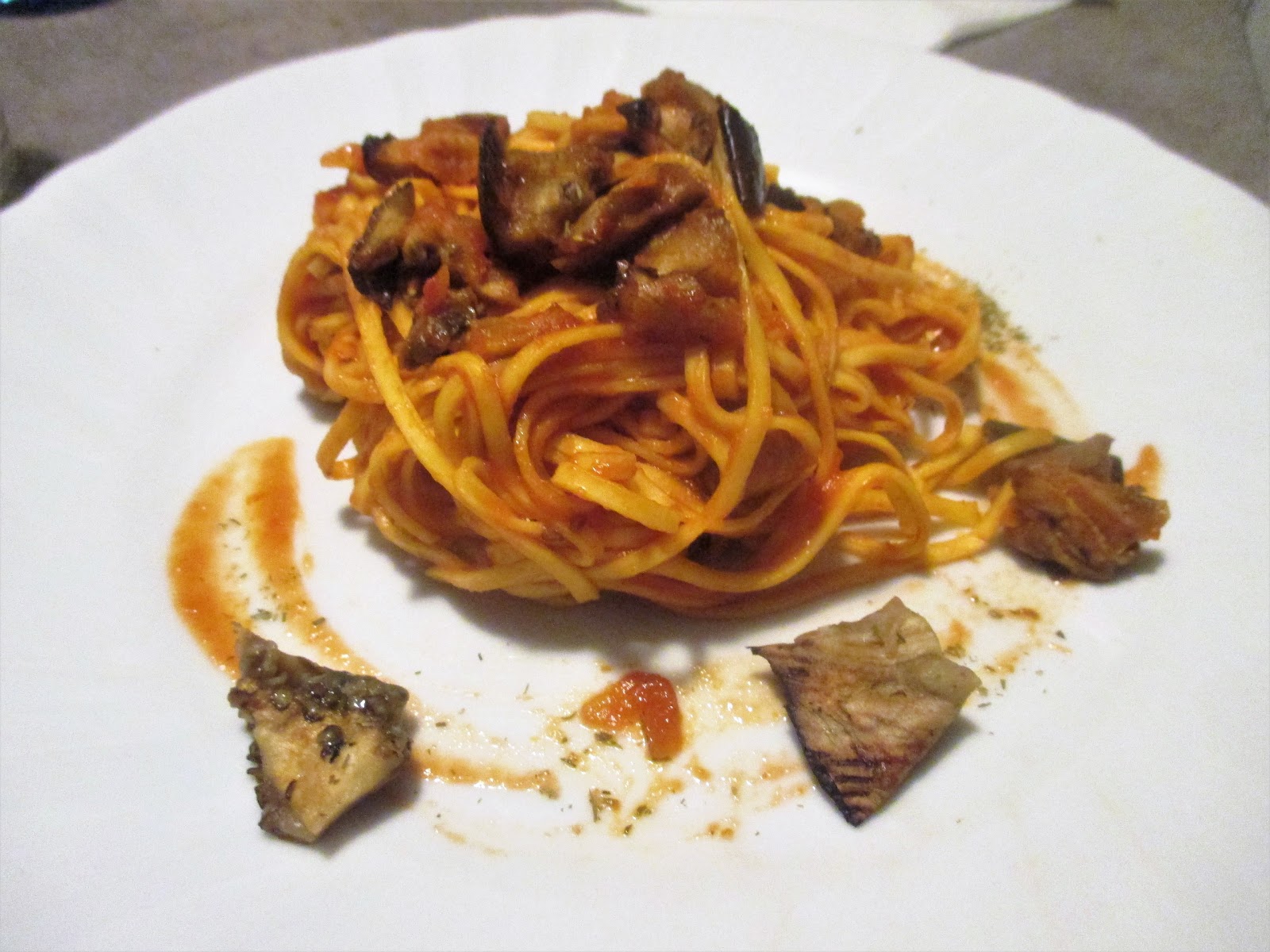 In a pan, make a light sauce with a little oil and a clove of garlic. Cook the artichokes, then add the eggplant and tomato sauce. Simmer everything together for about 5 minutes, then turn off the heat.