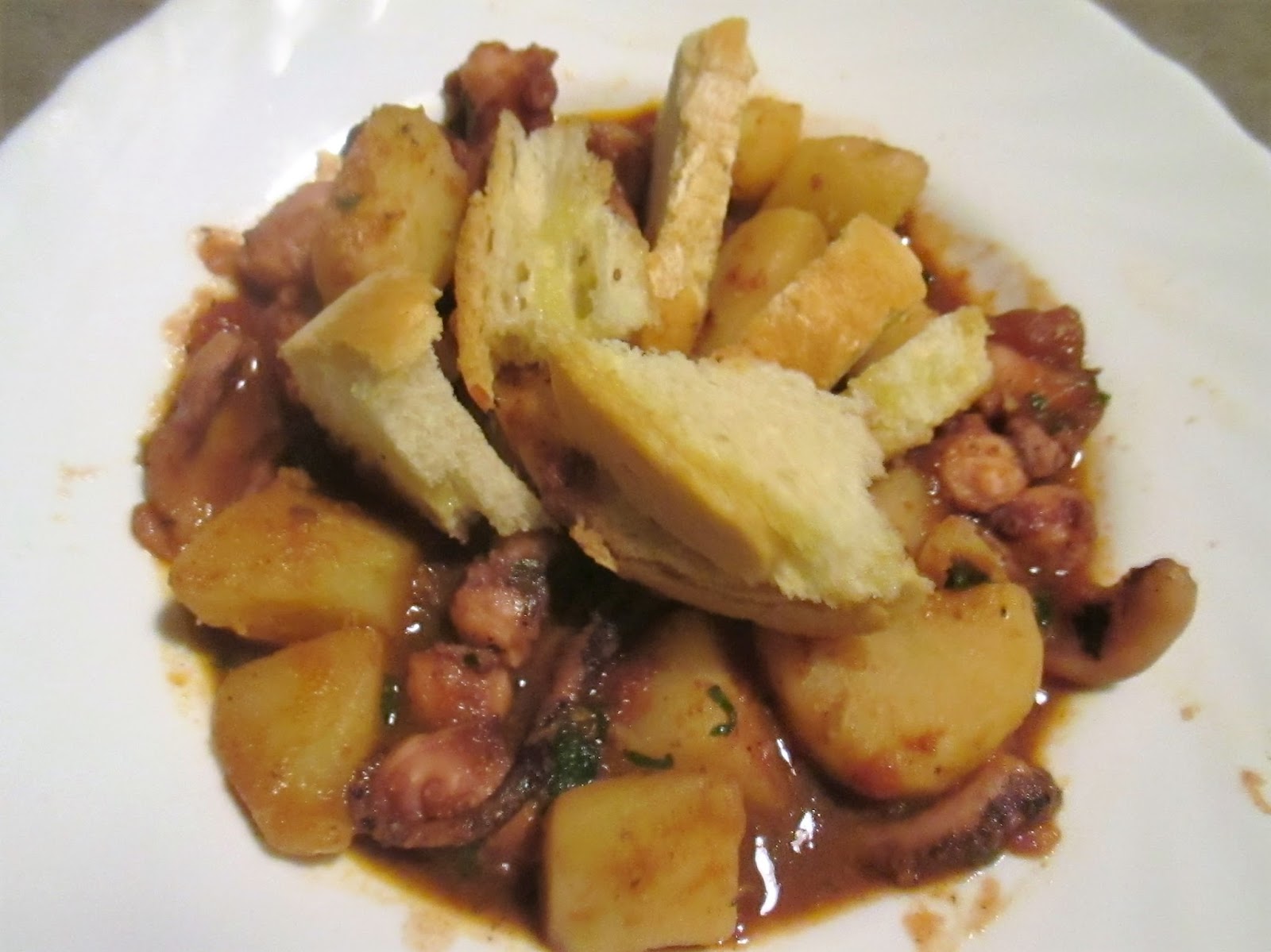 Now take a shallow saucepan and wide and heat the tomato sauce. Add the bell pepper and the octopus and cook for about 10 minutes. Then add the octopus and potatoes and cook for another 10 minutes. A obtained cooking, serve hot with croutons and chopped parsley by hand.