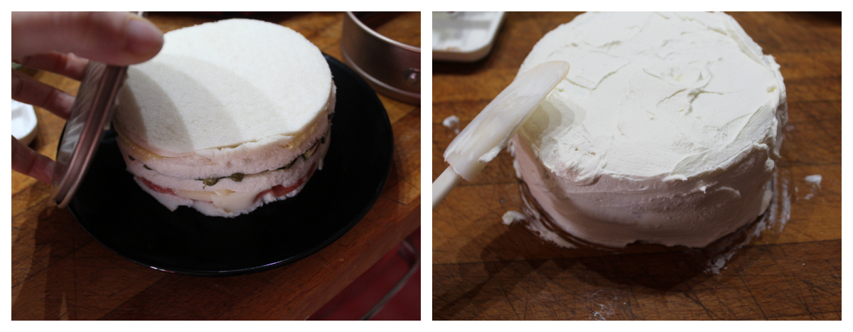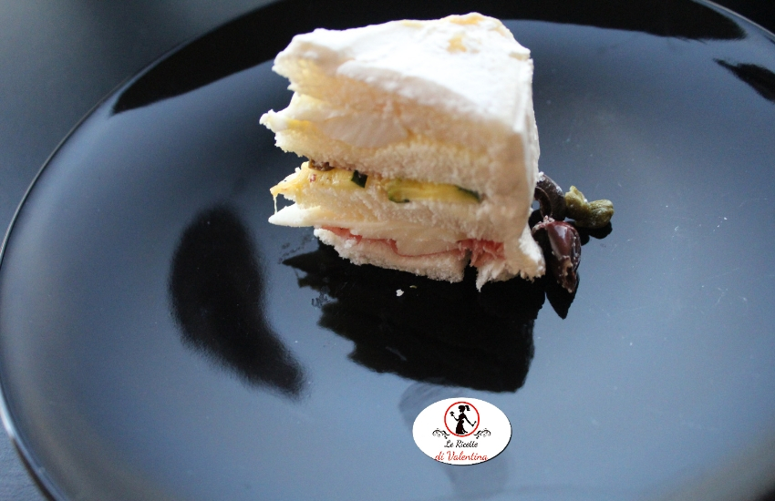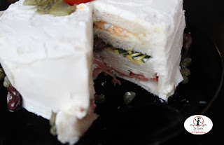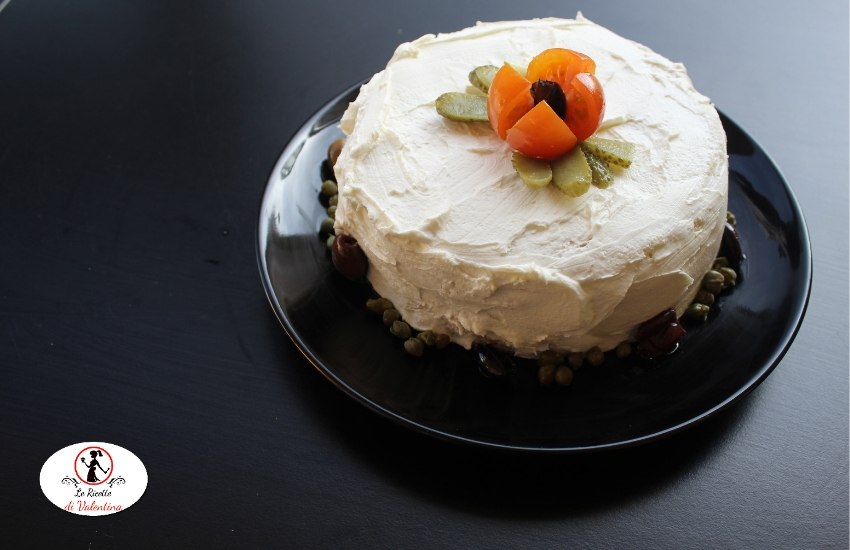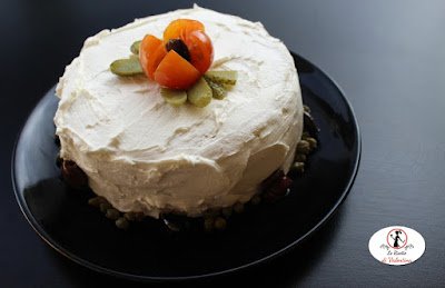 Non vi resterà che decorare la vostra torta con quello che preferite, sbizzarritevi come se fosse un vero dessert. Io ho creato un bordo di capperi e olive alla base e un fiore con un pomodorino e un cetriolino sottaceto sulla sommità.