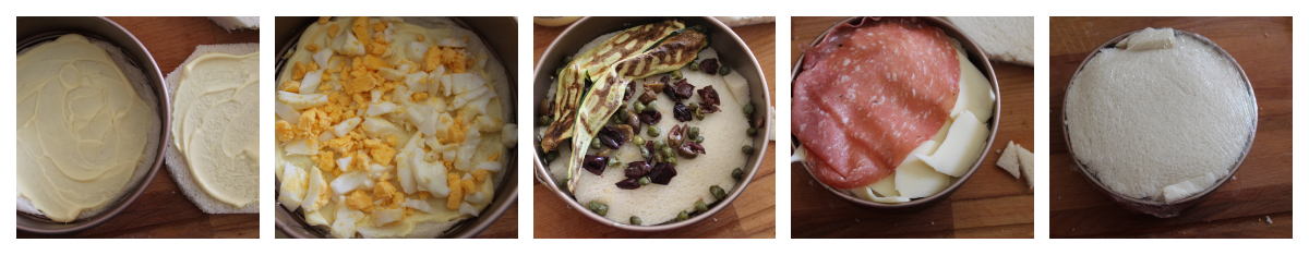 Spalmatala di maionese e così anche la seconda. Tritate l’uovo sodo a coltello dopo averlo sgusciato e ricoprite il primo strato di pane e maionese, adagiate sopra la seconda fetta dalla parte spalmata di salsa. Procedete con uno stato di olive, capperi e zucchine. Coprite con il pane e terminate con uno strato di formaggio e uno di golfetta. Chiudete la torta con l’ultima fetta di pane e pressate bene con le mani. Avvolgete tutto con la pellicola trasparente e riponete in frigorifero per almeno 30 minuti a riposare.