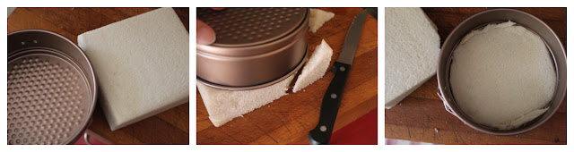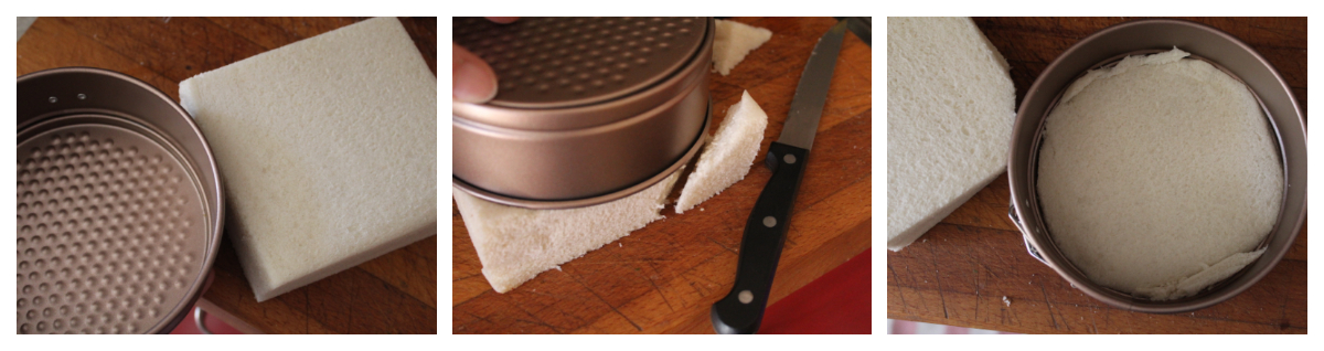 Dopo aver scelto lo stampo, utilizzatelo come guida per tagliare le fette di pane della forma giusta. Conservate gli scarti per chiudere eventuali buchi della preparazione. Sistemate sul fondo della teglia la prima fetta di pane.