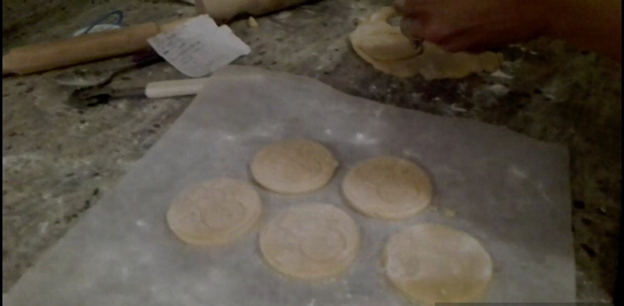 Impastate tutti gli ingredienti fino a formare una palla di pasta frolla. Stendete la pasta e, con l’aiuto di un bicchiere formate, dei dischi dello spessore di 3 mm.