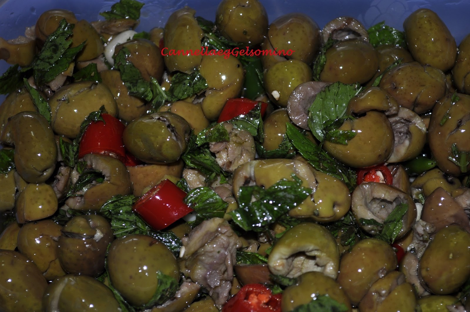 Condite le olive con olio nuovo, peperoncino, origano, aglio, menta, una spruzzata d’aceto e…. se avete la fortuna di abbinarle con del pane casereccio, sarà una vera goduria!