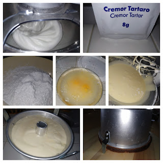 Ingredienti per la chiffon cake: 195 g di farina 00, 200 g di zucchero a velo, 133 g di acqua, 140 g di olio di semi, 4 uova, 1 bustina di lievito, 1 bustina di cremor tartaro, essenza o semi di vaniglia.