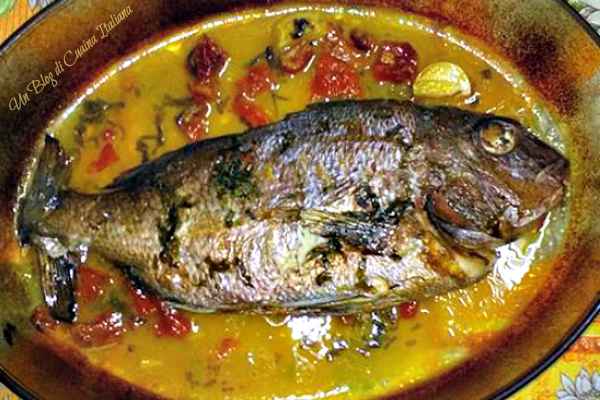 Varianti: se preferite cuocere le orate all’acqua pazza in forno, dopo averle eviscerate e condite internamente adagiatele in una pirofila unta d’olio, quindi unite tutti gli altri ingredienti e cuocete il tutto nel forno caldo a 220° per 25′ circa.