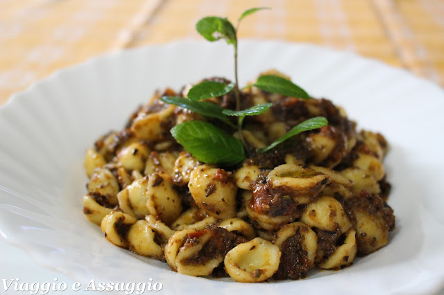 Cook pasta i boiling salted water. Prepare sauce: in a mixer put olives, sun-dried tomatoes, mint and basil, lemon juice, pepper and oil just enough to get a sauce. Mix well. Heat sauce for few minutes in a pan, add little pasta water. Season orecchiette with the sauce.