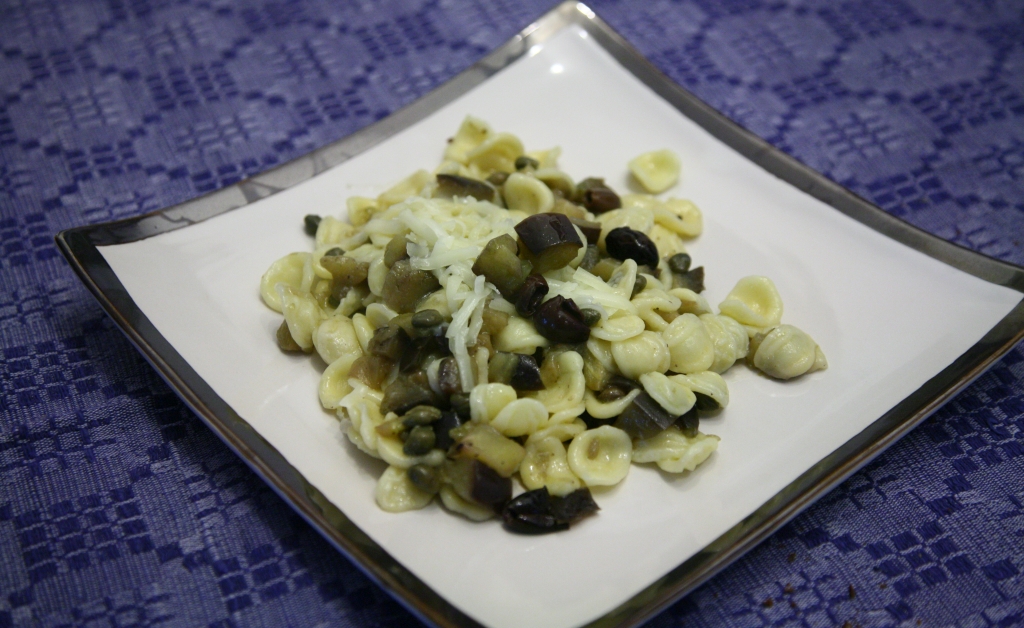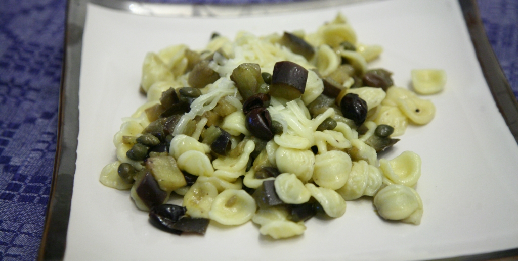 Le melanzane saporite con olive taggiasche e capperi sono utilizzate normalmente come contorno, io invece le ho utilizzate per condire le orecchiette fresche.