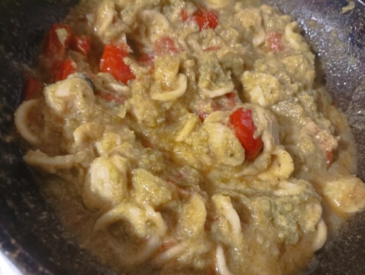 Preparazione delle Orecchiette con crema di broccoli e pomodorini