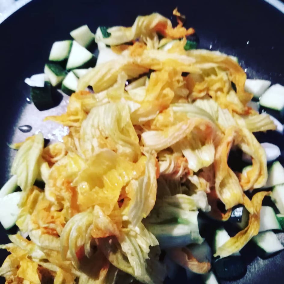 Ho pulito le zucchine ed i fiori di zucca e li ho fatti saltare in padella con olio e cipolla tritata.