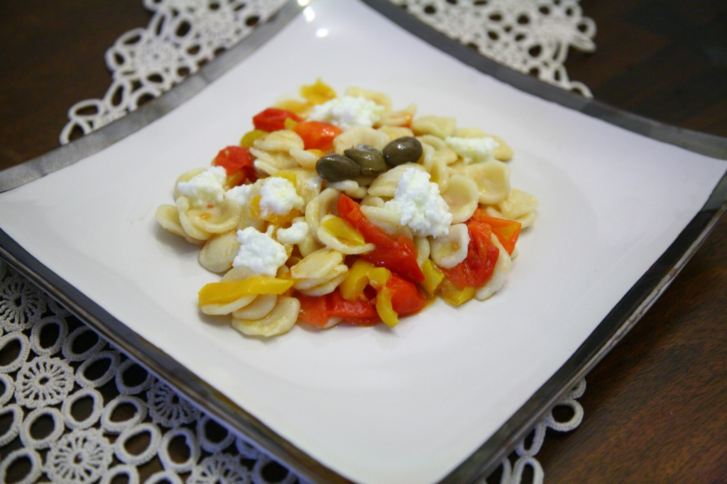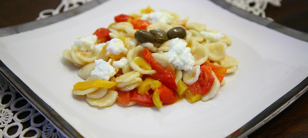 Scolare le orecchiette e aggiungerle al sugo di peperoni, pomodorini e olive e farle saltare un paio di minuti aggiungendo qualche cucchiaio di acqua di cottura.