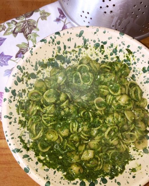 Un pesto è quello che ci voleva, ho aggiunto soltanto qualche noce, un pezzetto di una formaggella stagionata di capra comprata in montagna e un filo d’olio.