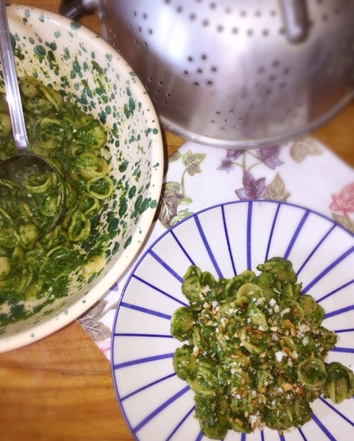 Ho ottenuto un pesto di un bel verde vivo dal sapore fresco e dalla consistenza perfetta per condire delle orecchiette integrali.