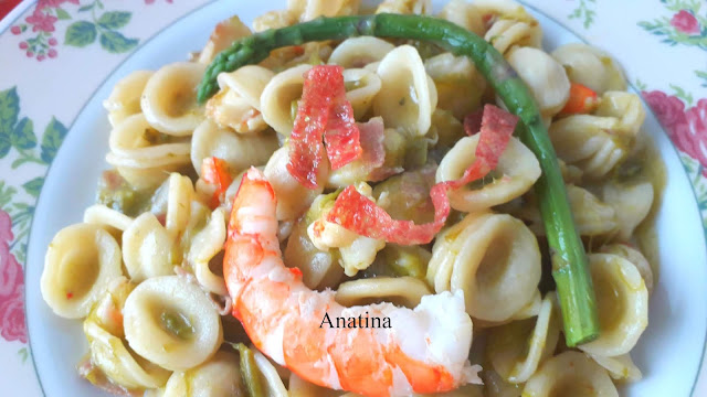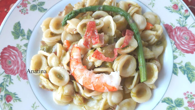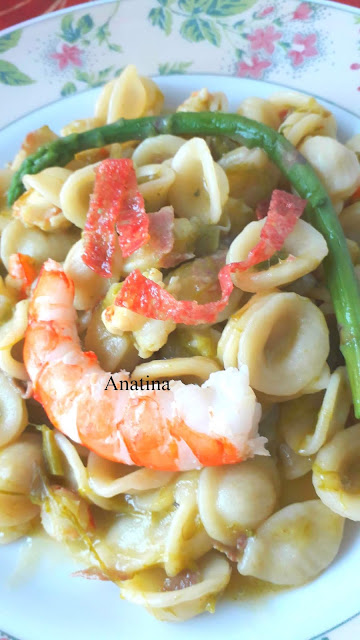 facciamo dorare i gamberi saliamo e pepiamo e subito poi togliamo sia i gamberi interi che gli asparagi interi e li mettiamo da parte,Intanto che cuociamo la pasta togliamo tutti i gamberi e asparagi