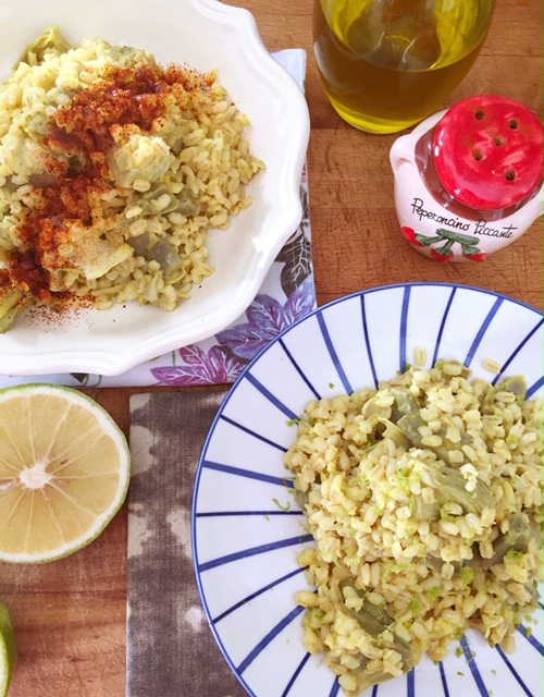 Li ho racchiusi in un sano e confortante “orzotto” ai carciofi, e devo dire che il sapore forte della curcuma e del bergamotto, abbinato all’orzo e ai carciofi, ci sta molto bene.