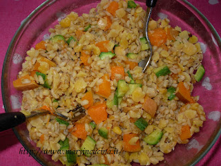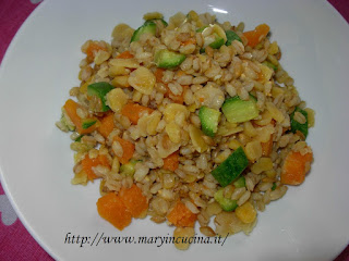 Tenere in ammollo l’orzo per una notte, eliminare l’acqua di ammollo e cuocerlo con le cicerchie per mezz’ora. Tagliare a cubetti zucca e zucchine e cuocerle in padella con un filo d’olio ed un po’ di cipolla per una decina di minuti, aggiungendo un po’ d’acqua e mescolando di tanto in tanto. Unire l’orzo alle verdure, aggiungere un po’ di sale ed un po’ di curry, mescolare bene e portare in tavola.