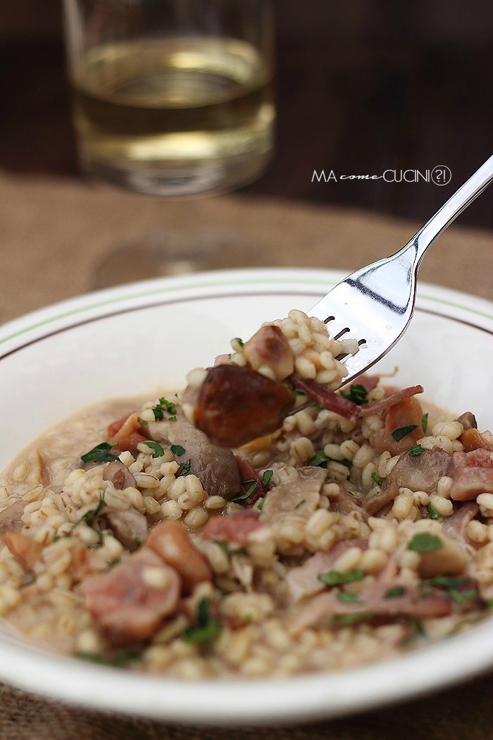 In una padella mettete a scaldare dell’olio evo, fateci soffriggere uno spicchio d’aglio, aggiungete i funghi e fateli rosolare per 4-5 minuti, dopodiché versate l’orzo, date una mescolata e coprite il tutto con il brodo, man mano che si asciugherà aggiungetene altro e mescolate.