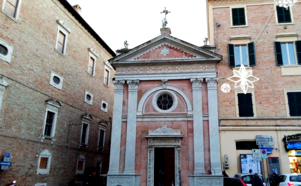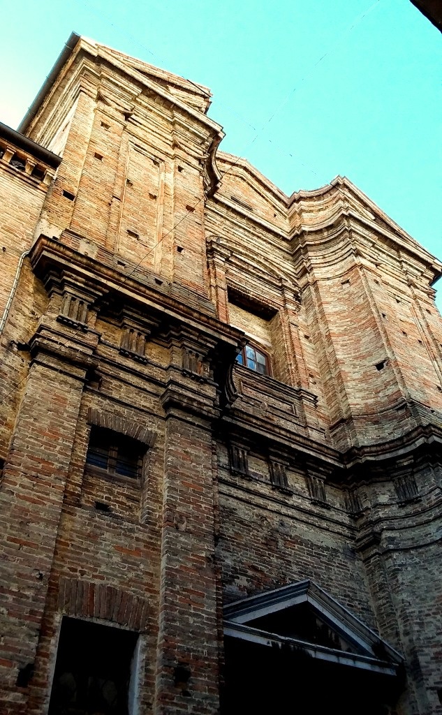 E’ piacevole curiosare e perdersi per le strade, le piazze, i vicoli di Osimo, così ricchi di edifici storici, palazzi nobiliari, case antiche e chiese “minori”, alcune semplici e lineari, altre più elaborate e d’effetto, come questa, che mi piace mostrare per la particolarità delle geometrie in rilievo che ne movimentano la facciata.