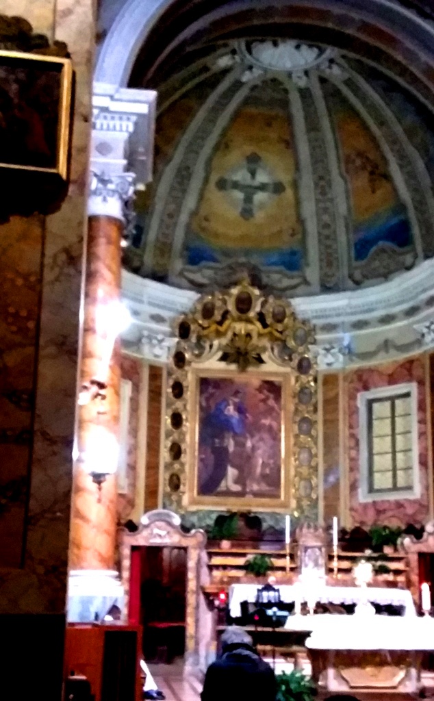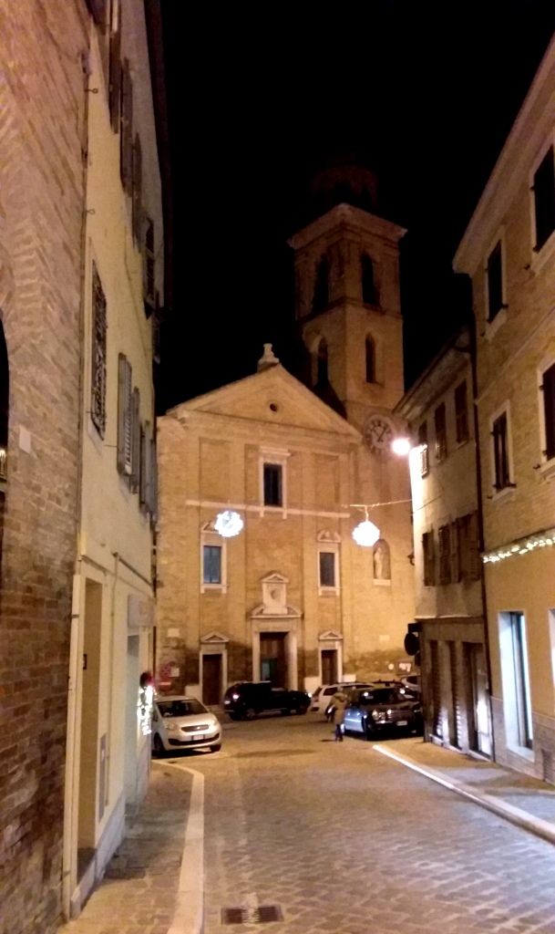 La notte sta per sopraffare il giorno e la Chiesa di San Marco è l’ultima cosa di Osimo che riusciamo a vedere. Ci tenevamo particolarmente perchè, tra le varie opere conservate al suo interno spicca una “Vergine del Rosario” datata 1642 del Guercino . Purtroppo l’impossibilità di avvicinarmi per una funzione in corso e la luce fioca hanno prodotto una foto un po’ sfocata, ma che rende comunque un’idea dell’insieme.