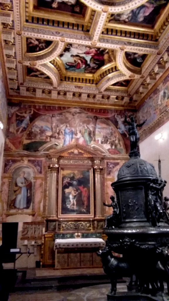 Affianco al Duomo sorge il Battistero di San Giovanni. All’apparenza semplice ed insignificante, cela al suo interno tesori di insospettabile bellezza, primo fra tutti lo scenografico soffitto seicentesco, riccamente decorato con soggetti religiosi incastonati in una rete di fregi dorati.