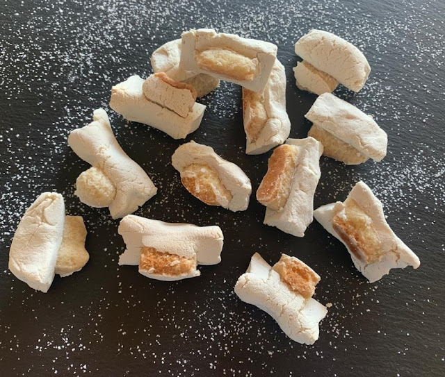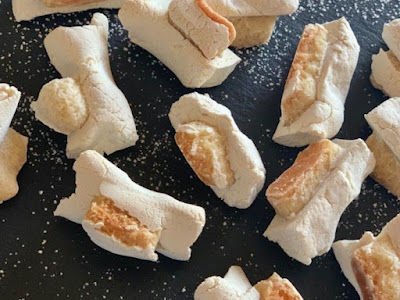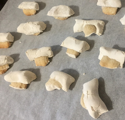 Al terzo giorno i biscotti saranno asciutti e di colore bianco con la base più scura. Trascorso il tempo trasferiteli, dopo averne bagnato la base, su una teglia foderata con carta forno bagnata e fateli cuocere a 180° per 10/15 minuti. Sfornate le ossa dei morti quando lo zucchero sciogliendosi si separerà dalla parte bianca che rimarrà vuota e formerò la classica base caramellata.