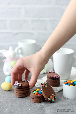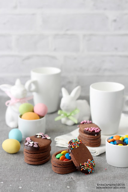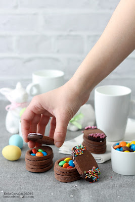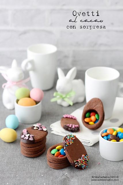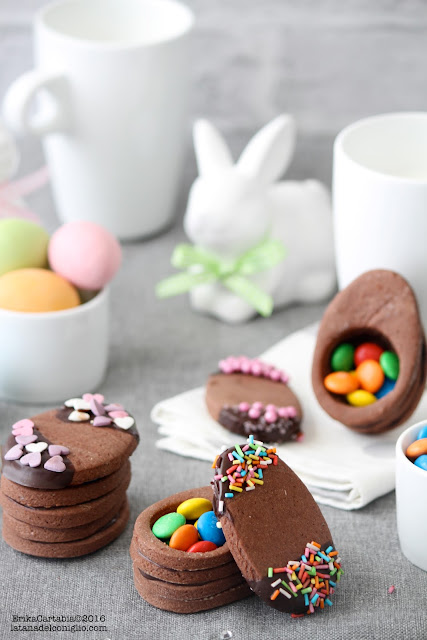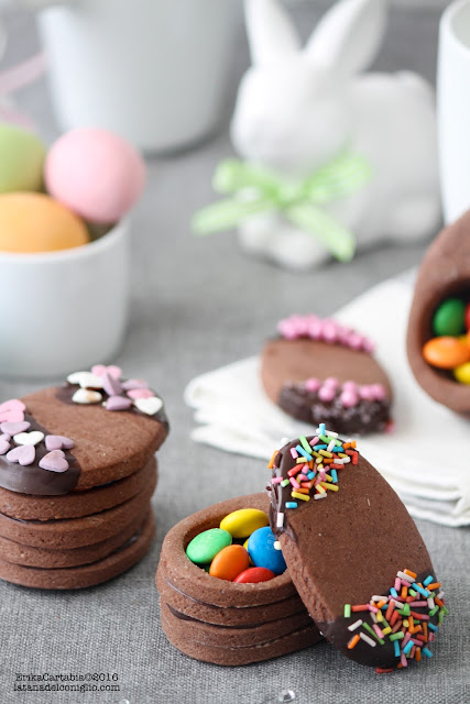 Una semplice pasta frolla al cacao talvolta può trasformarsi in qualcosa di divertente e simpatico. Per festeggiare la Pasqua non potevo quindi lasciarmi scappare l’occasione di trasformare dei classici frollini al cacao in ovetti con sorpresa. Piccoli scrigni, facilissimi da realizzare e perfetti da riempire con caramelle o confetti al cioccolato per far felici i più piccoli!