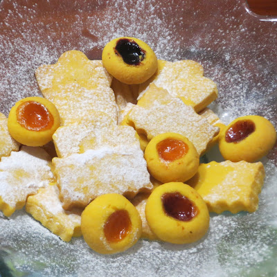 Riprendete la pasta e stendetela con il mattarello su una superficie infarinata e tagliate con degli stampini i biscotti, oppure fate delle palline, grandi quanto una noce e con la punta di un cucchiaino praticate delle fossette da riempire di marmellata.