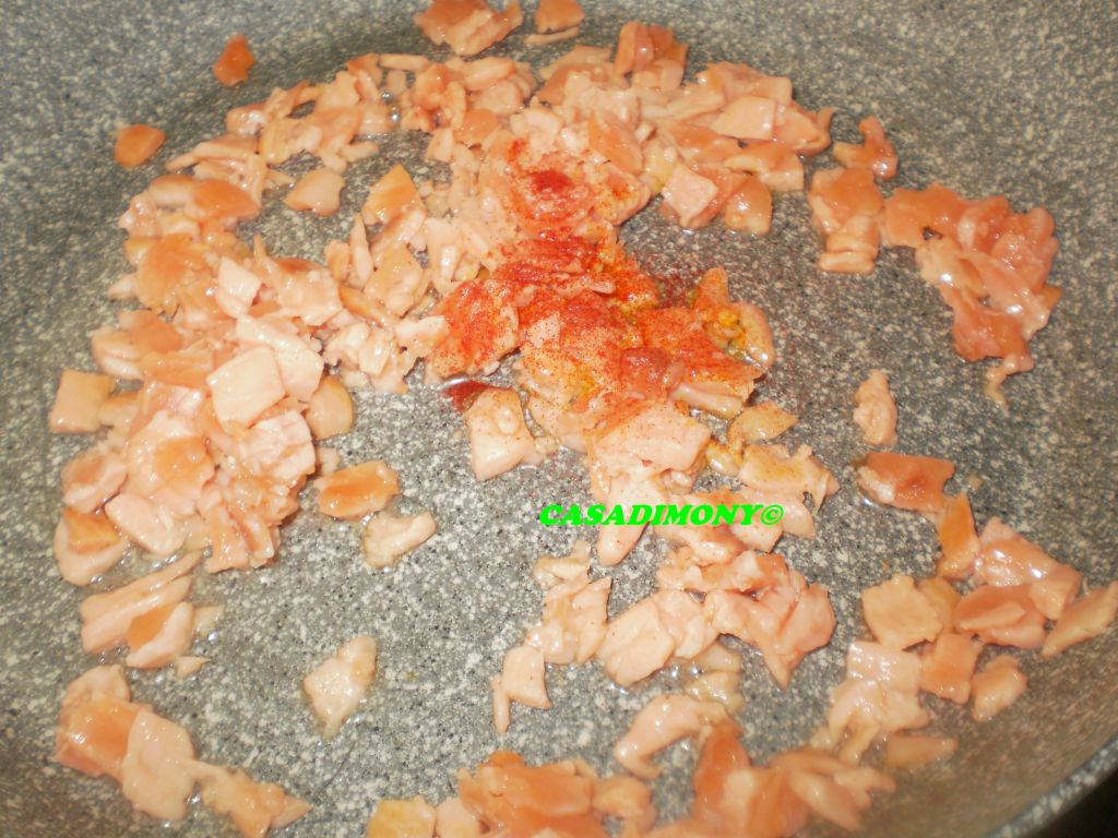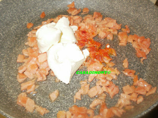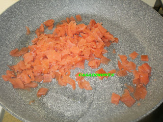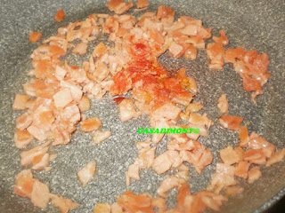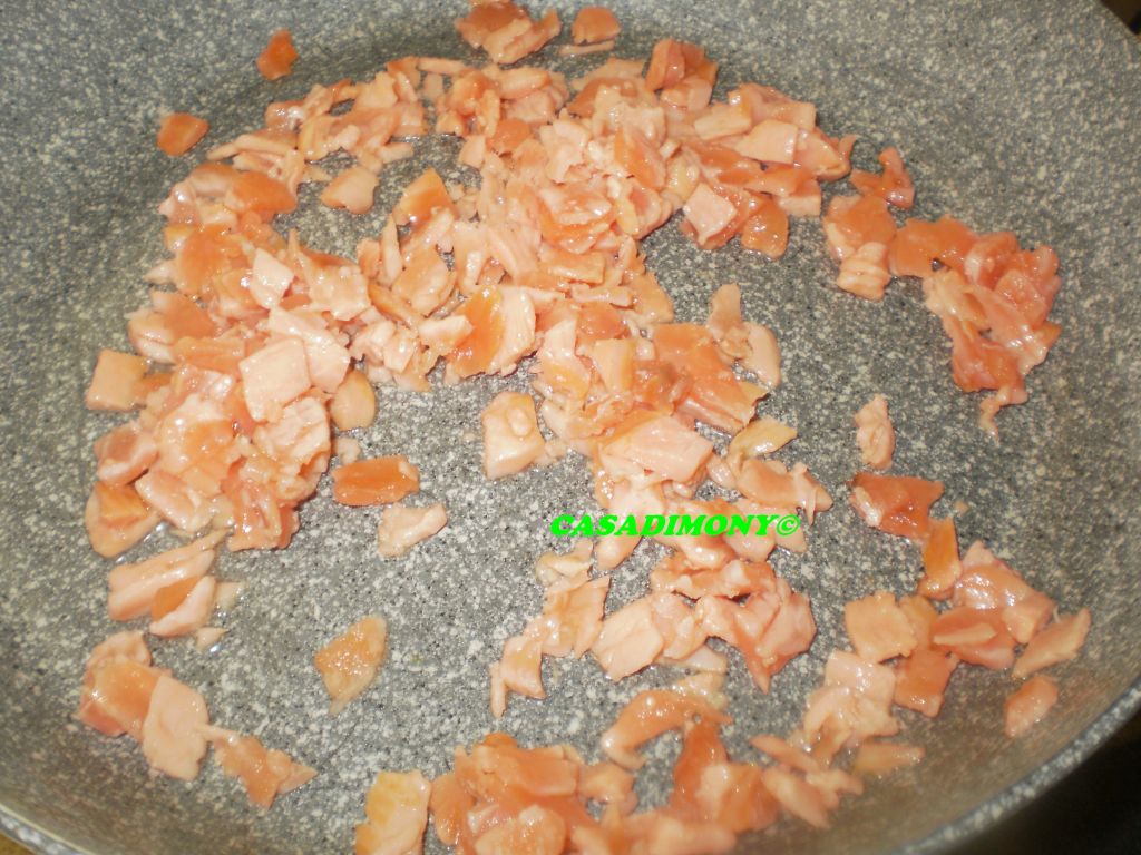 Per prima cosa ho tagliato il salmone a pezzetti, poi l’ho fatto rosolare con un filino di olio per pochi minuti