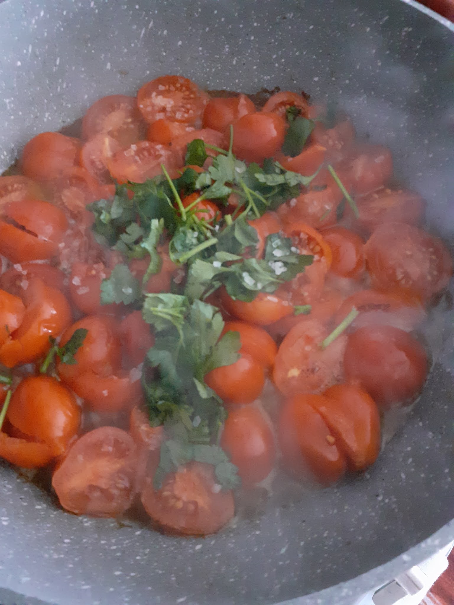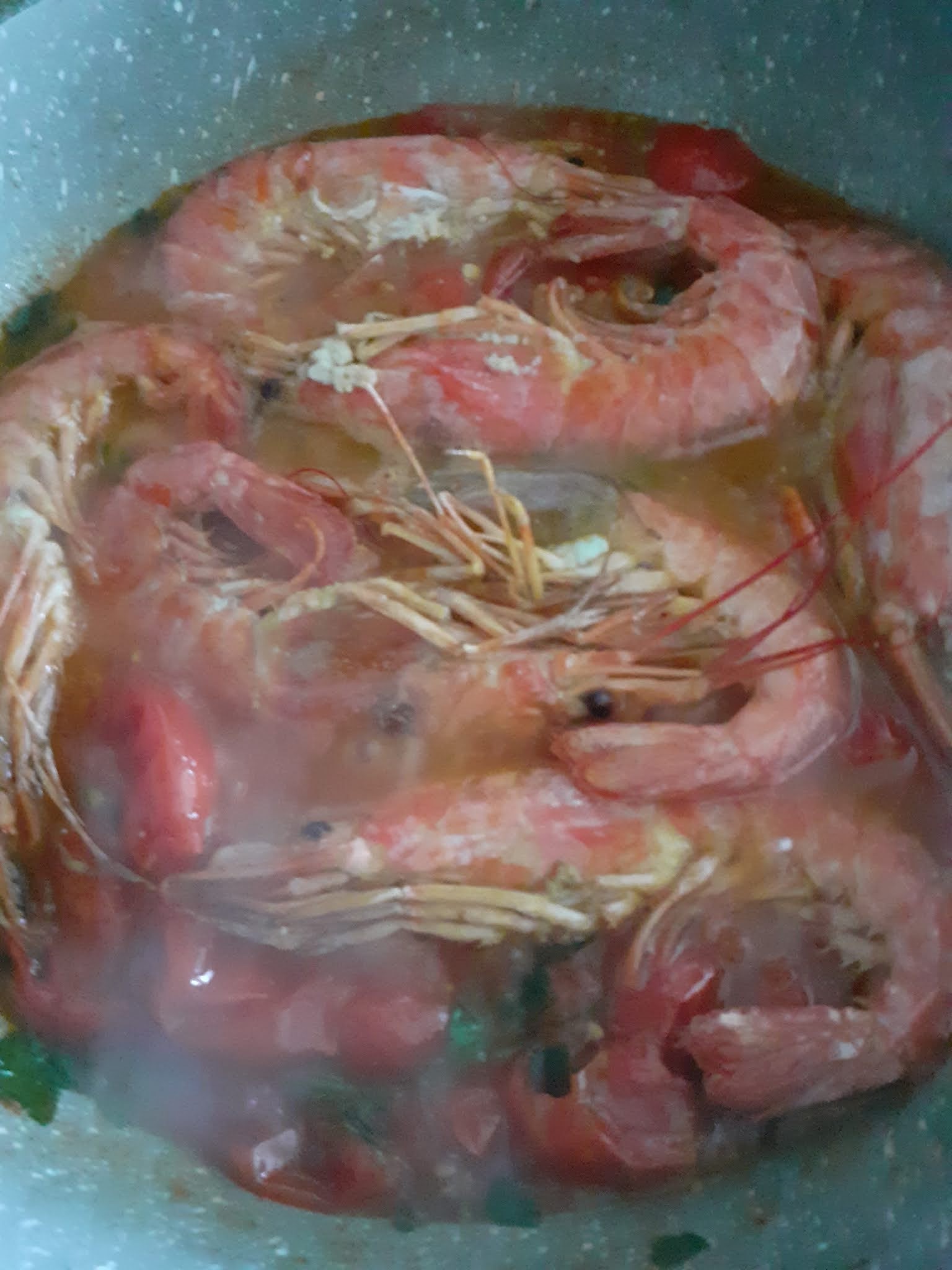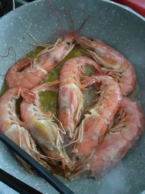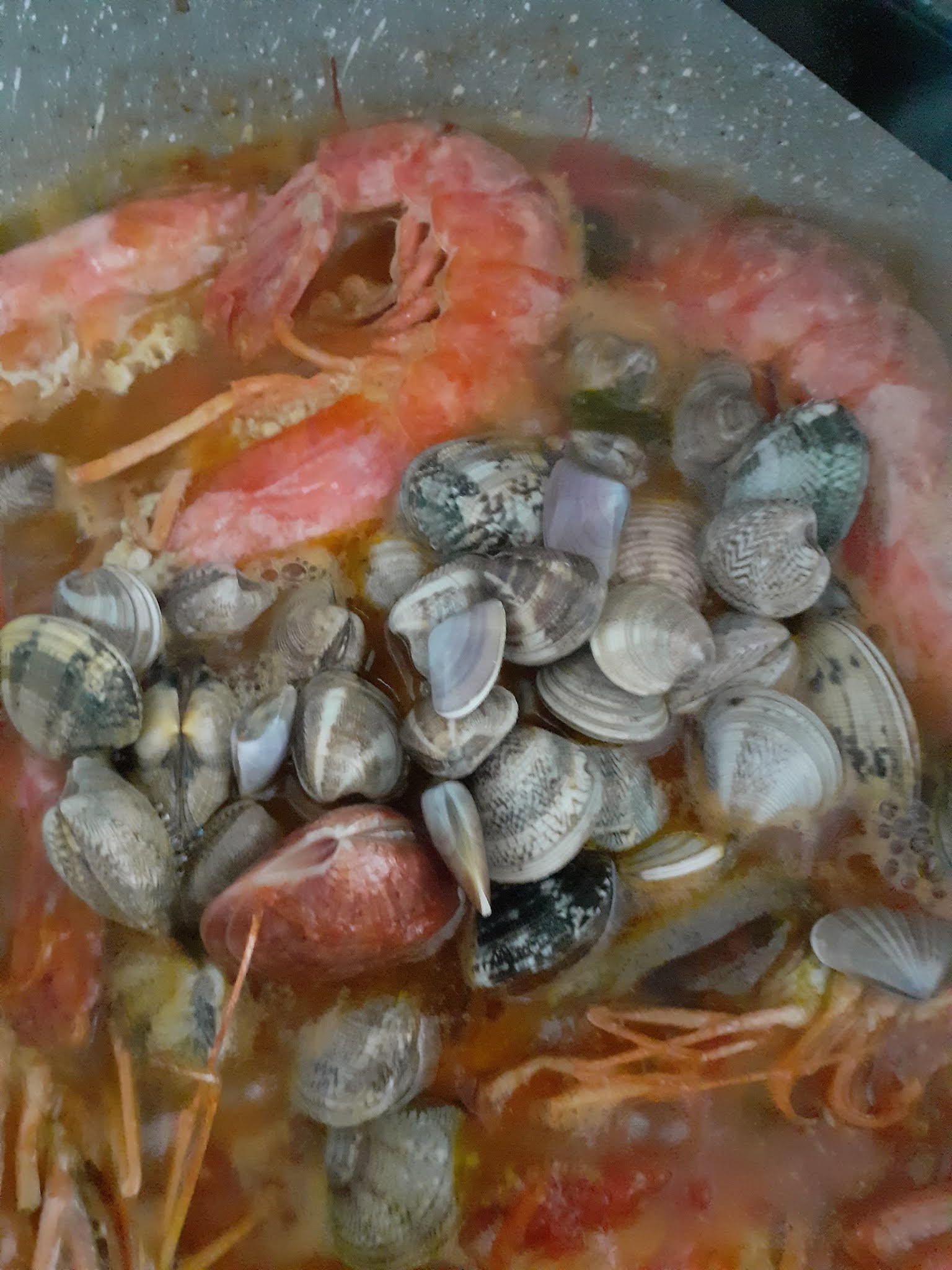 In una casseruola alta, olio, aglio tritato e gamberoni a rosolare da ambo i lati,alzarli ed unire all’olio i pomodorini spezzettati ed il prezzemolo tritato,poco sale pepe,appena appassiti,rimettere i gamberoni in casseruola , fare spazio al centro e aggiungere i frutti di mare,coprire e attendere che aprano.