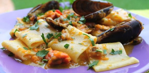 Pulite per bene le cozze sotto l’acqua corrente. Adoperando un paglietta d’acciaio raschiate le cozze, eliminate eventuali incrostazioni e la ‘barbetta’ che fuoriesce dal guscio.Riponete le cozze e pulite anche le vongole passandole sotto l’acqua corrente.In una pentola capiente fate rosolare un aglio in olio extravergine di oliva, quindi riponetevi cozze e vongole. Fate cuocere fino a quando i gusci si schiuderanno. Nel frattempo mettete a cuocere i paccheri in acqua bollente salata.Scolate la pasta al dente e versatela nella padella con i frutti di mare. Aggiungere la crema di zucca e mantecate. Servite i paccheri spolverizzando con prezzemolo tritato.