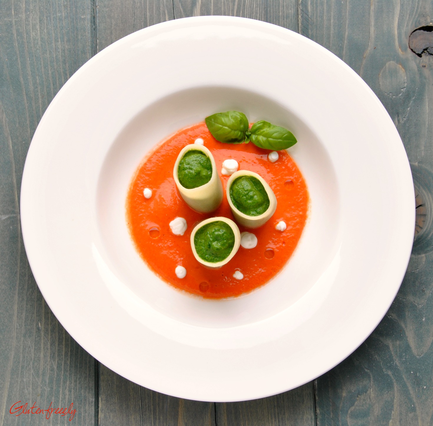 In un piatto fondo mettete qualche cucchiaio di pomodoro, adagiate i paccheri in verticale e con un cucchiaio o con l’aiuto di una sac a poche riempiteli con gli spinaci.
