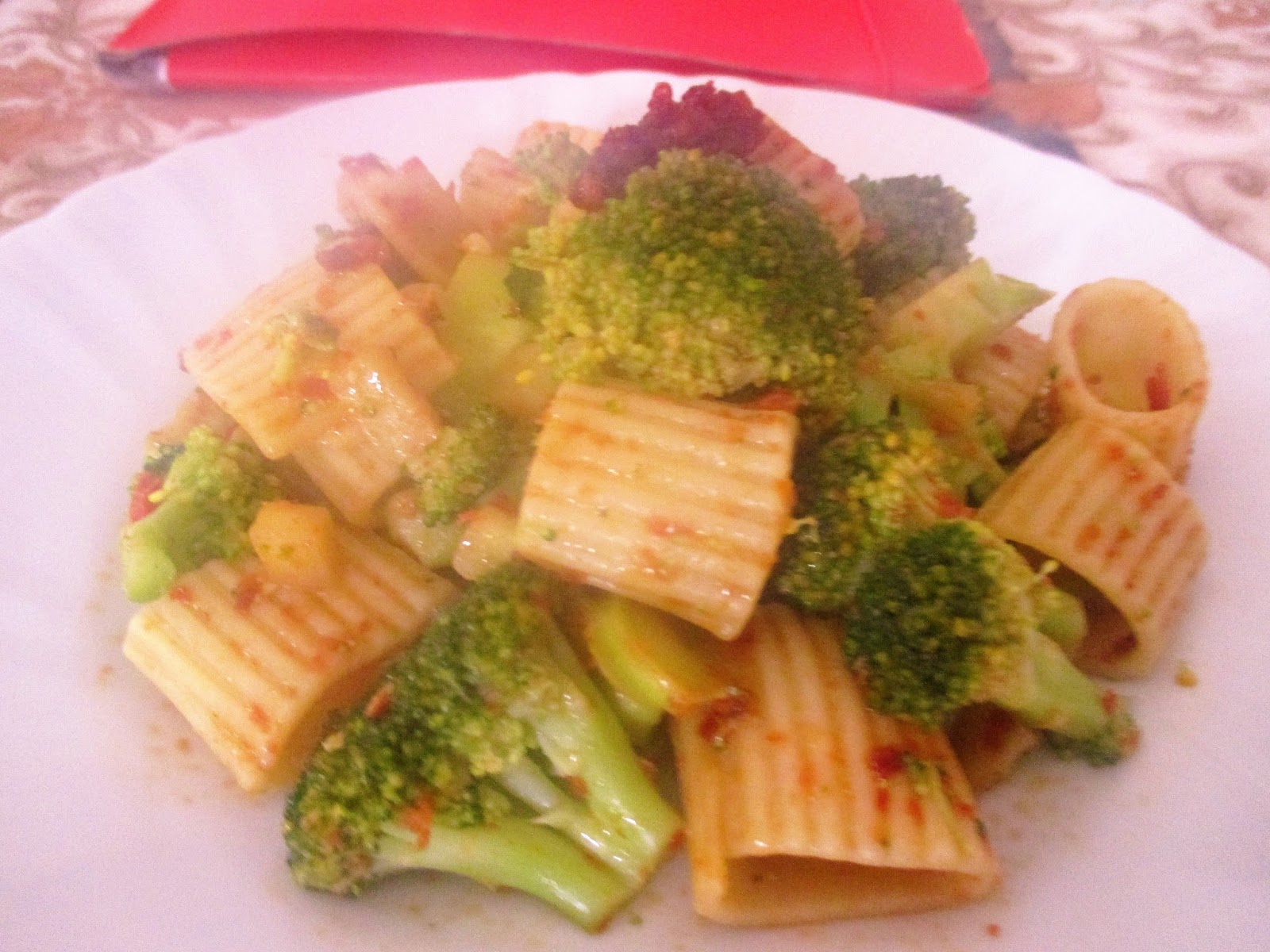 In a pan, make a sauce with olive oil and garlic. Add the anchovies, broccoli and sauce of dried tomatoes.