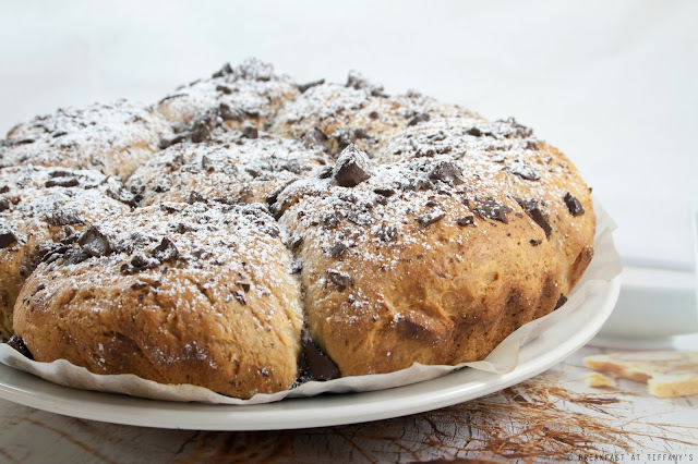 Suddividere l’impasto in 8 palline di ugual dimensione e posizionarle all’interno dello stampo circolare foderato con la carta forno; cospargere il dolce con il cioccolato tritato grossolanamente.