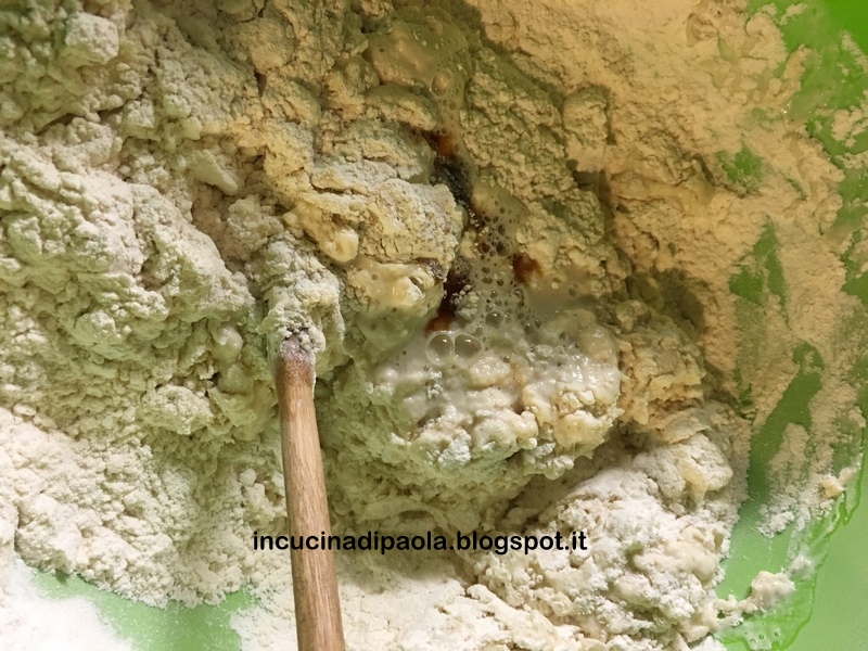 Mescolate bene fino a rendere il composto omogeneo. Mettete in una ciotola le due farine setacciate, aggiungete il lievito, una parte dell’acqua e incominciate a mescolare con un cucchiaio di legno.