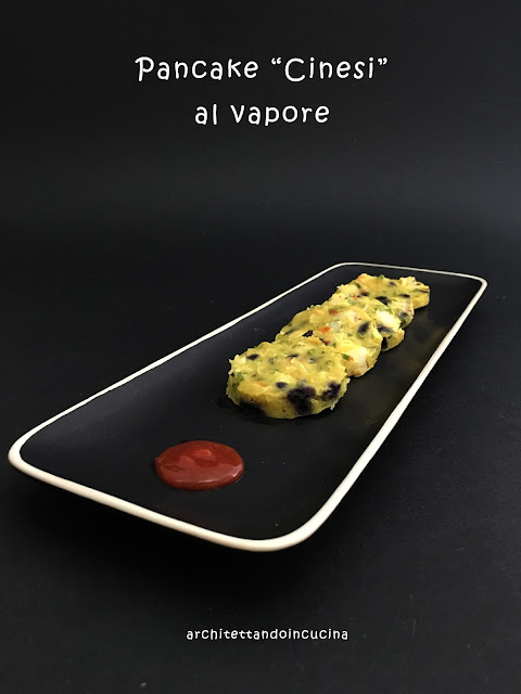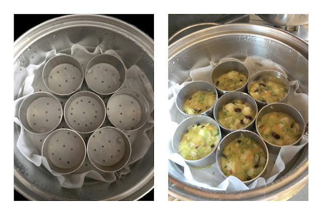 Preparare la vaporiera e coprire i fori con un foglio di carta forno ritagliato a misura. Inserire sopra alla carta forno stampini da biscotti rotondi di 6 cm di diametro. Appena l’acqua bolle, inserire in ogni stampino 1 cucchiaio abbondante di composto e far cuocere a vapore per 5 minuti.