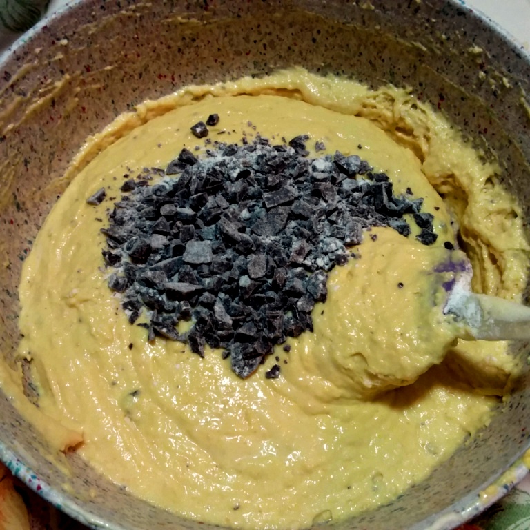 - Inserire gradualmente la farina setacciandola e le scaglie di cioccolato infarinate (per evitare che precipitino sul fondo), mescolando dal basso verso l’alto, senza smontare la massa.