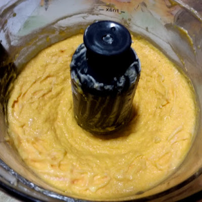 - Tagliare l’arancia intera (buccia compresa) a pezzi e frullare in un cutter insieme al mascarpone, alla curcuma e allo zucchero vanigliato, fino ad ottenere una crema.