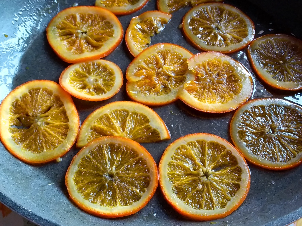 - Le fettine di arancia caramellate conviene prepararle il giorno prima, così hanno modo di asciugarsi un po’. Tagliare un’arancia a fette sottili per il senso opposto agli spicchi. Poi in una padella larga antiaderente far sciogliere e imbiondire appena il miele con lo zucchero. Adagiare le fettine e farle andare per qualche minuto.