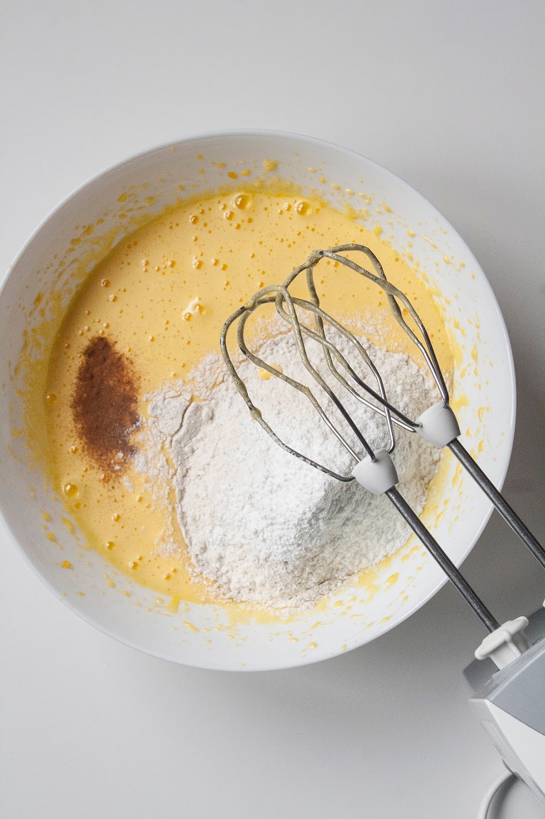 In una ciotola mettete le 2 uova intere e montatele con lo zucchero semolato fino a renderle chiare e spumose; poi unite l’olio, un pizzico di cannella, la farina 00 setacciata con il lievito in polvere e per ultimo la purea di mele.
