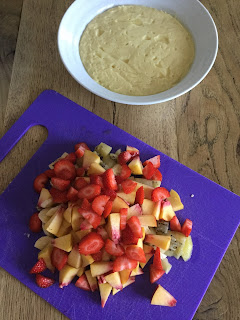 Preparare la frutta tagliata della dimensione e forma che preferite e spruzzatela con il succo di un limone, in modo che non si annerisca.